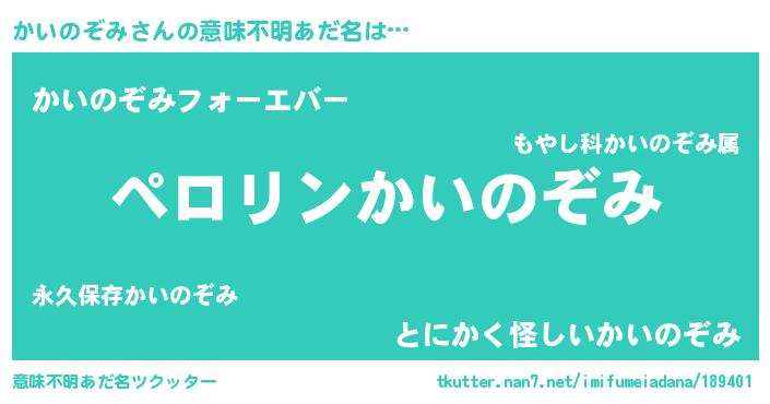 | 男性向けラノベタイトル風あだ名 | 『うちのかいのぞみが世界を掌握している!』 |