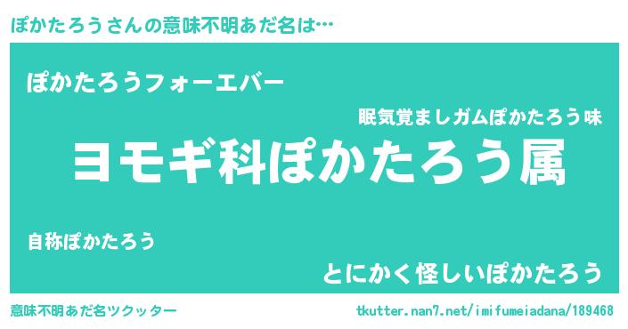 | 男性向けラノベタイトル風あだ名 | 『ぽかたろう~年齢イコール彼女いない歴の魔法使い~』 |