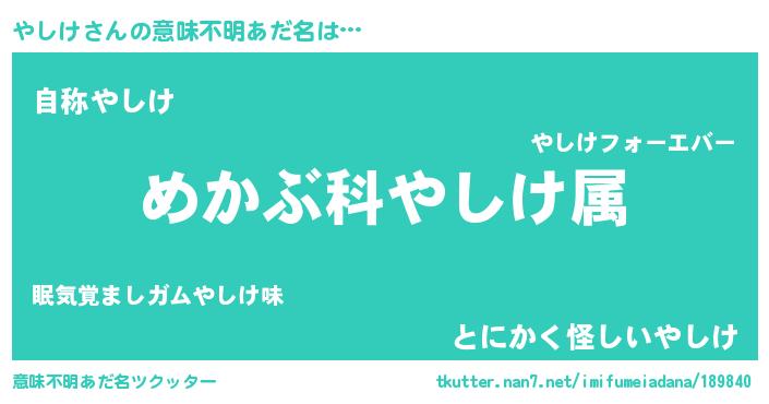 | 男性向けラノベタイトル風あだ名 | 『ヤシケスレイヤー』 |