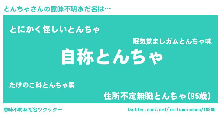 | 男性向けラノベタイトル風あだ名 | 『Re:とんちゃから始める異世界生活』 |