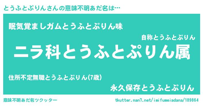 | 男性向けラノベタイトル風あだ名 | 『とうふとぷりん~年齢イコール彼女いない歴の魔法使い~』 |