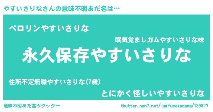 | 胡散臭い通販商品みたいなあだ名 | 『来世でも幸せになれる健康食品…その名も「やすいさりな」』 |