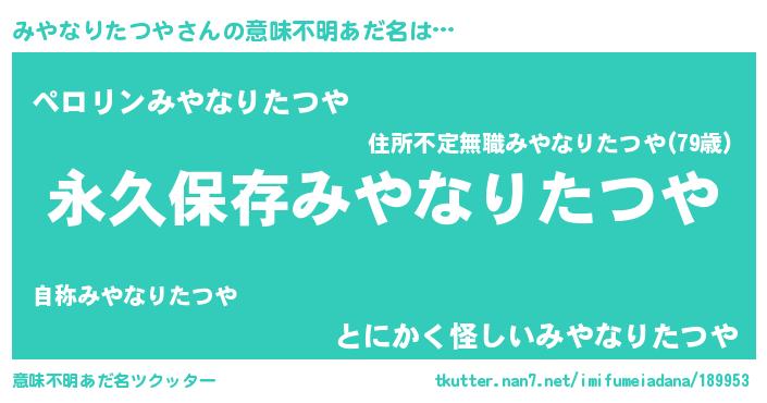 | 男性向けラノベタイトル風あだ名 | 『うちのみやなりたつやが世界を掌握している!』 |