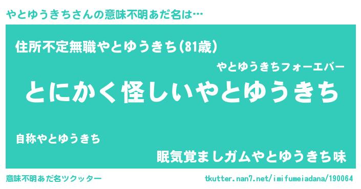 | 胡散臭い通販商品みたいなあだ名 | 『信頼と実績のサプリメント…その名も「やとゆうきち」』 |