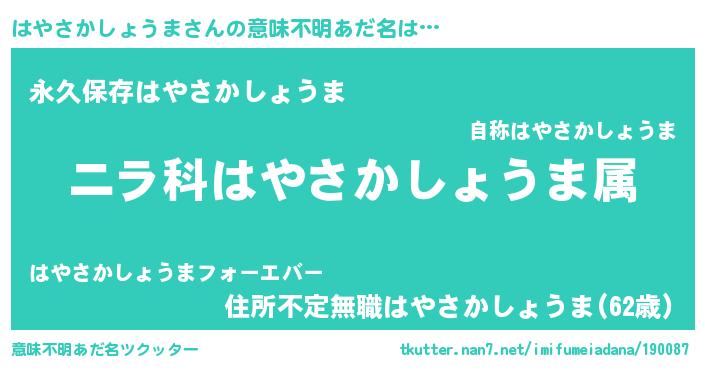 | 男性向けラノベタイトル風あだ名 | 『はやさかしょうま~年齢イコール彼女いない歴の魔法使い~』 |