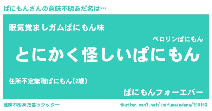 | 男性向けラノベタイトル風あだ名 | 『ダンジョンにぱにもんを求めるのは間違っているだろうか』 |