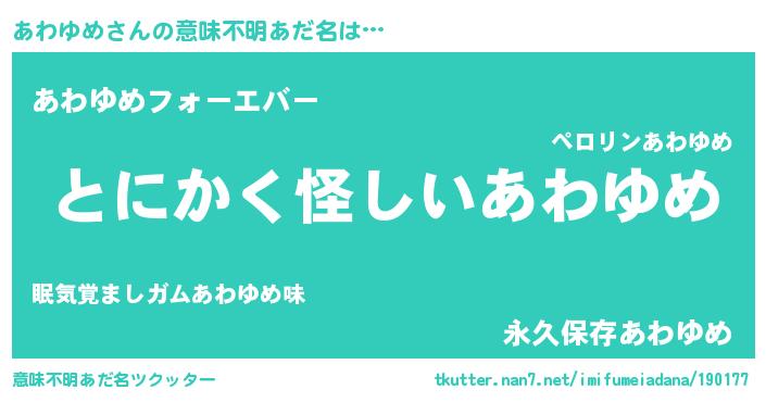 | 女子向けラノベタイトル風あだ名 | 『あわゆめの卵を拾いまして』 |