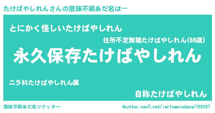 | ヘコむあだ名 | 『たけばやしれん(笑)』『たけお』 |