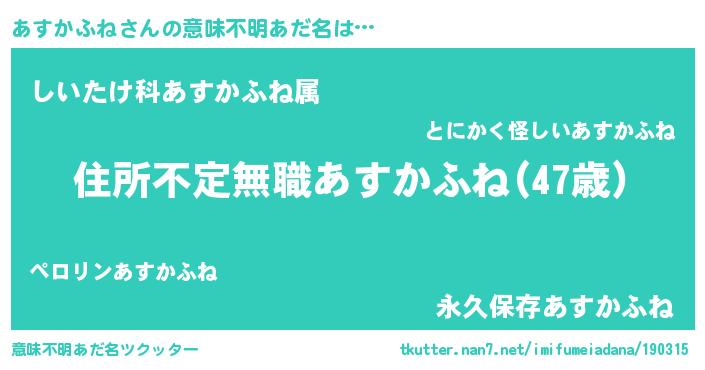 | 女子向けラノベタイトル風あだ名 | 『乙女ゲームの破滅フラグしかない悪役あすかふねに転生してしまった…』 |