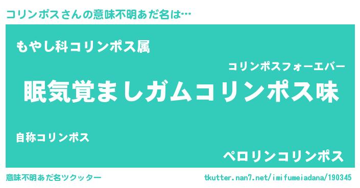 | 男性向けラノベタイトル風あだ名 | 『コリンポスに滅ぼされるだけの簡単なお仕事です』 |