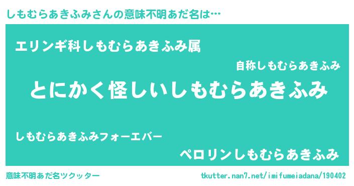 | 男性向けラノベタイトル風あだ名 | 『しもむらあきふみの嫁は女の子じゃないと思った?』 |