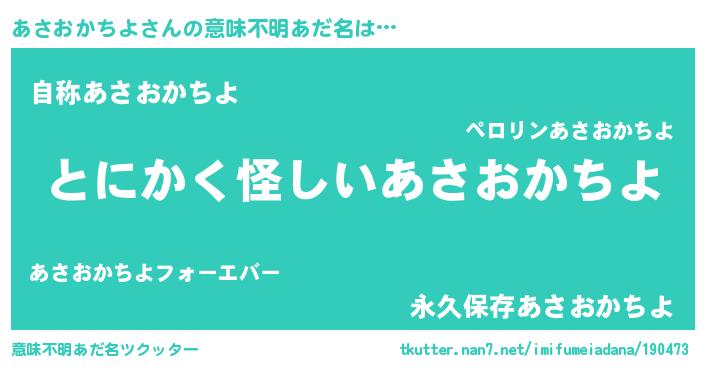 | 女子向けラノベタイトル風あだ名 | 『あさおかちよの卵を拾いまして』 |