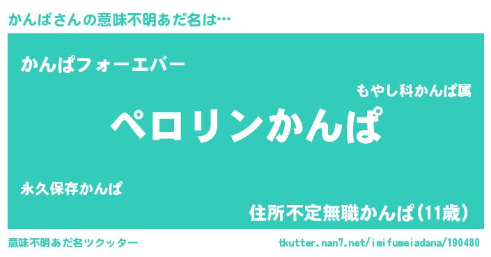 | 男性向けラノベタイトル風あだ名 | 『かんぱの憂鬱』『魔弾の王とかんぱ』 |