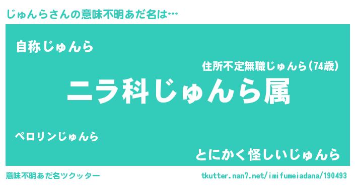 | 男性向けラノベタイトル風あだ名 | 『じゅんら~年齢イコール彼女いない歴の魔法使い~』 |