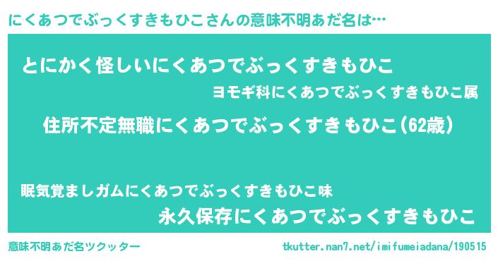 | 伝説のあだ名 | 『孤高の僧侶にくあつでぶっくすきもひこ』 |