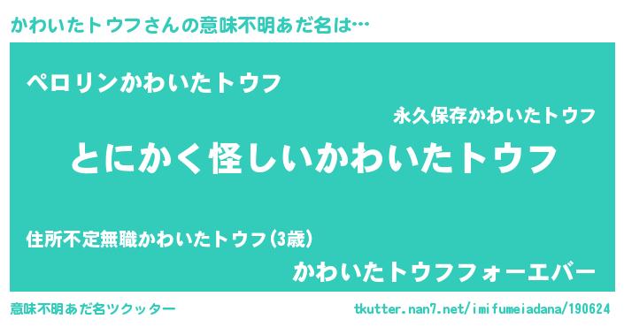 | 男性向けラノベタイトル風あだ名 | 『ダンジョンにかわいたトウフを求めるのは間違っているだろうか』 |