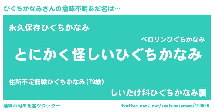| 女子向けラノベタイトル風あだ名 | 『ひぐちかなみの卵を拾いまして』 |
