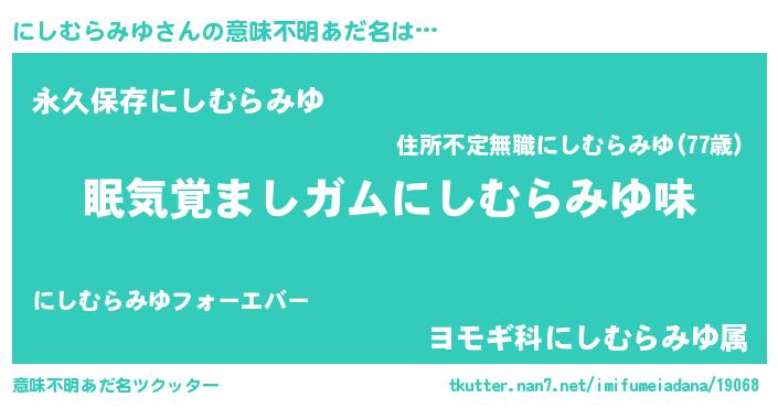 | 男性向けラノベタイトル風あだ名 | 『おまえをオタクにしてやるから、俺をにしむらみゆにしてくれ! 』 |