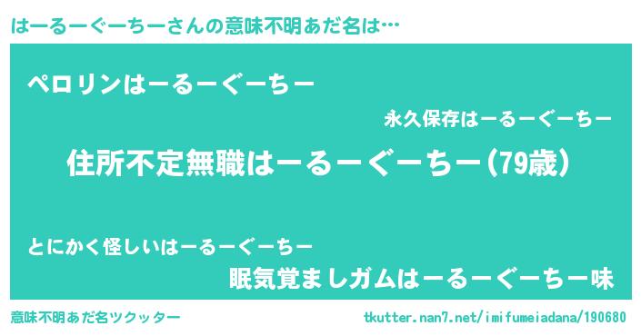 | 料理風あだ名 | 『はーるーぐーちーのカルパッチョ風』 |