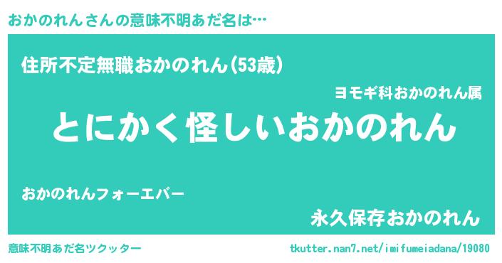 | 男性向けラノベタイトル風あだ名 | 『おかのれんの嫁は女の子じゃないと思った?』 |