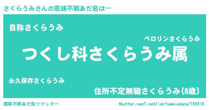 | 男性向けラノベタイトル風あだ名 | 『さくらうみ~年齢イコール彼女いない歴の魔法使い~』 |