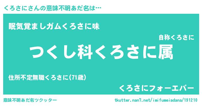 | 男性向けラノベタイトル風あだ名 | 『くろさに~年齢イコール彼女いない歴の魔法使い~』 |