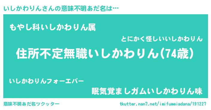 | 胡散臭い通販商品みたいなあだ名 | 『あなたにだけ特別に提供する世界で10本だけ現存している希少なブランデー…その名も「いしかわりん」』 |