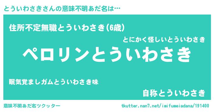| 欧米人風あだ名 | 『アンジェラ・とういわさき』 |