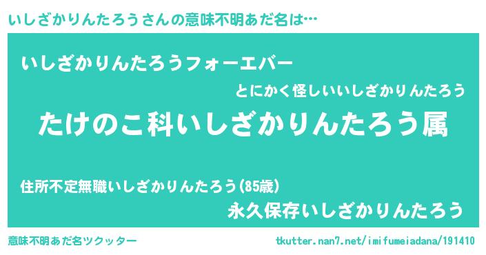 | 男性向けラノベタイトル風あだ名 | 『転生したらいしざかりんたろうだった件』 |