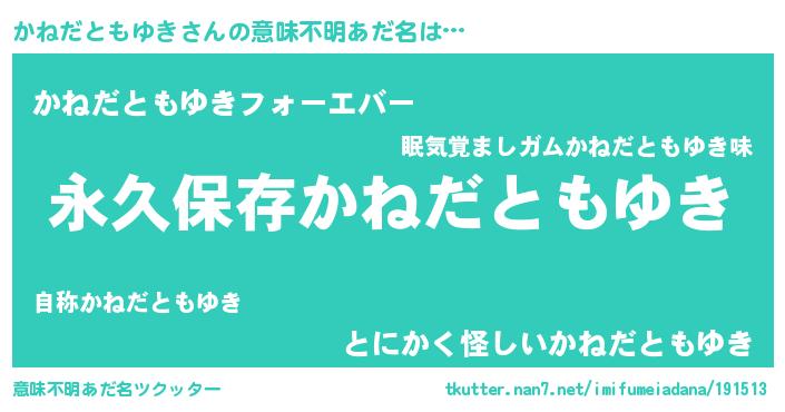 | 胡散臭い通販商品みたいなあだ名 | 『来世でも幸せになれる水素水…その名も「かねだともゆき」』 |