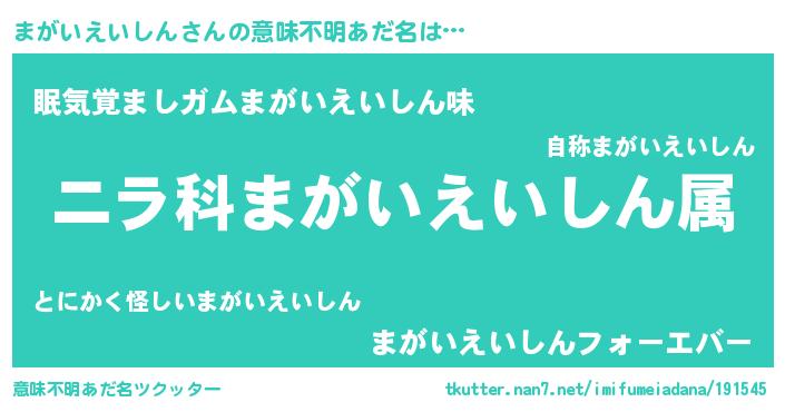 | 男性向けラノベタイトル風あだ名 | 『まがいえいしん~年齢イコール彼女いない歴の魔法使い~』 |