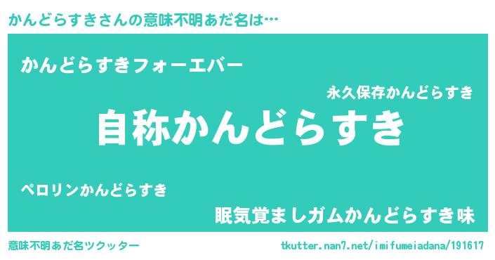 | 女子向けラノベタイトル風あだ名 | 『かんどらすきなんてお断りですっ。』 |