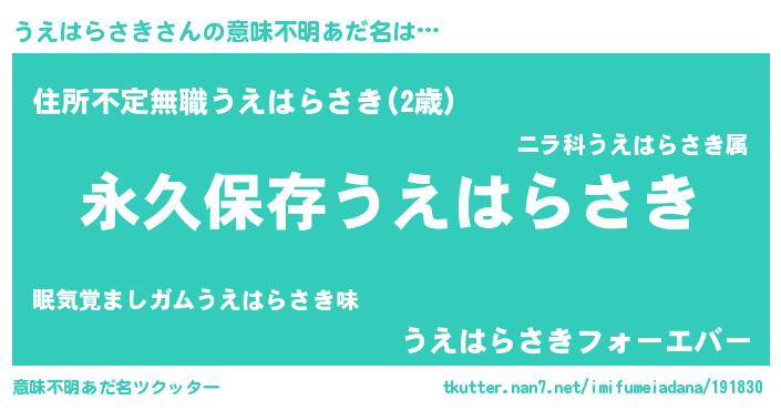 | 胡散臭い通販商品みたいなあだ名 | 『来世でも幸せになれる水素水…その名も「うえはらさき」』 |
