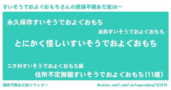 | 胡散臭い通販商品みたいなあだ名 | 『信頼と実績のサプリメント…その名も「すいそうでおよぐおもち」』 |