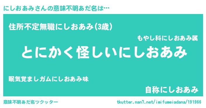 | 男性向けラノベタイトル風あだ名 | 『にしおあみに滅ぼされるだけの簡単なお仕事です』 |