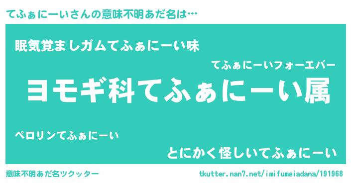 | 男性向けラノベタイトル風あだ名 | 『てふぁにーい~年齢イコール彼女いない歴の魔法使い~』 |