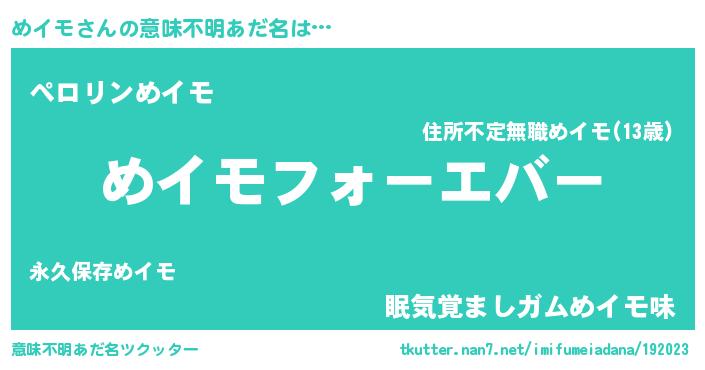 女子向けラノベタイトル風あだ名 | 『めイモ伯爵の花嫁』『死神めイモの再婚』 |