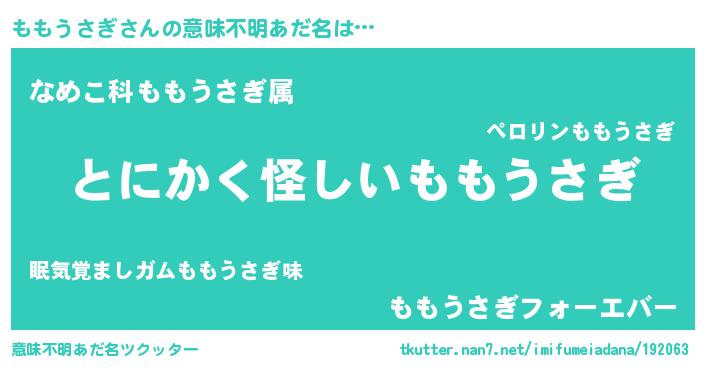 | 男性向けラノベタイトル風あだ名 | 『ももうさぎの嫁は女の子じゃないと思った?』 |