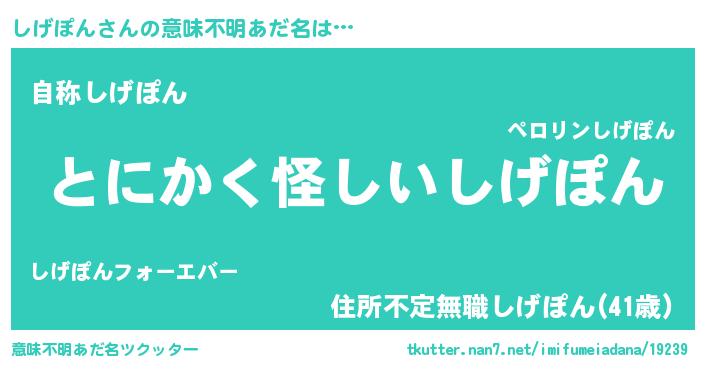 | 男性向けラノベタイトル風あだ名 | 『ダンジョンにしげぽんを求めるのは間違っているだろうか』 |