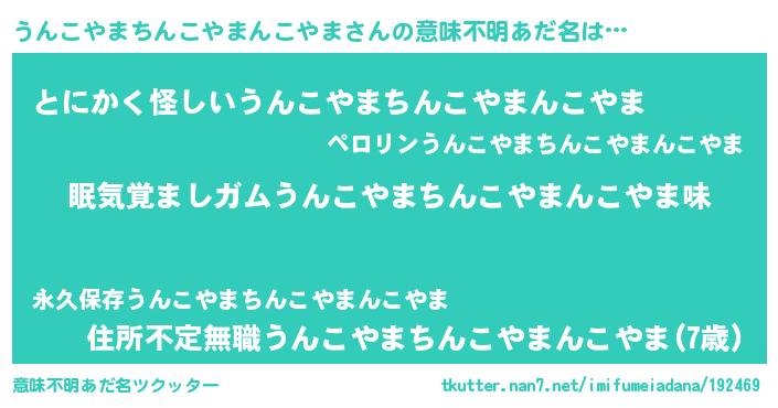| 男性向けラノベタイトル風あだ名 | 『おまえをオタクにしてやるから、俺をうんこやまちんこやまんこやまにしてくれ! 』 |