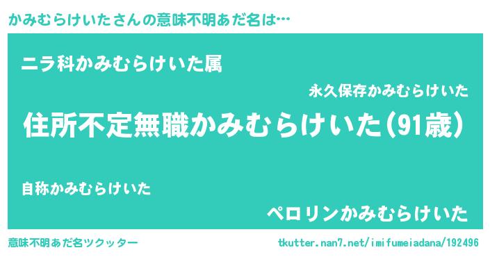 | 男性向けラノベタイトル風あだ名 | 『この素晴らしい世界にかみむらけいたを!』 |