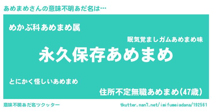 | 男性向けラノベタイトル風あだ名 | 『あめまめという概念が存在しない退屈な世界 』 |