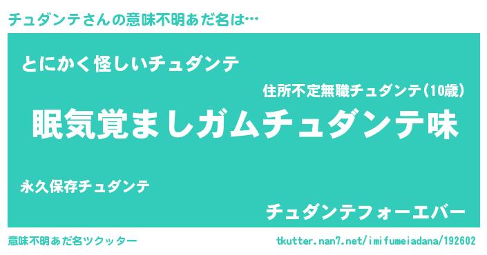 | 男性向けラノベタイトル風あだ名 | 『チュダンテに滅ぼされるだけの簡単なお仕事です』 |