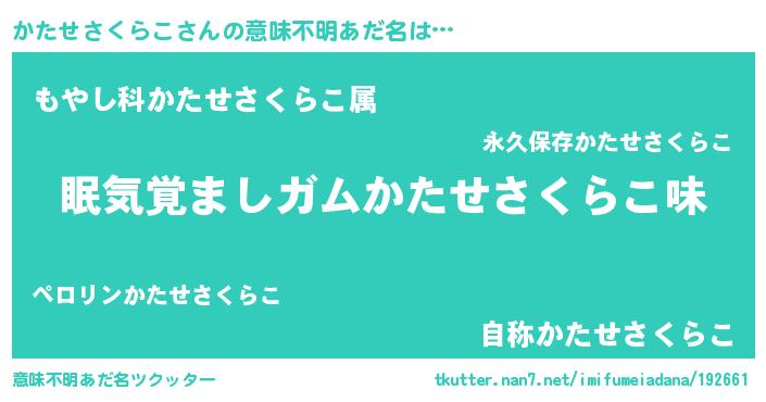 | 男性向けラノベタイトル風あだ名 | 『うちのかたせさくらこが世界を掌握している!』 |