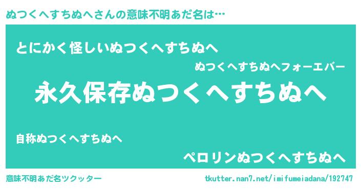 | 男性向けラノベタイトル風あだ名 | 『ぬつくへすちぬへという概念が存在しない退屈な世界 』 |