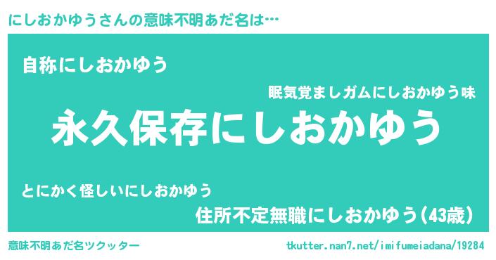 | 男性向けラノベタイトル風あだ名 | 『にしおかゆうという概念が存在しない退屈な世界 』 |