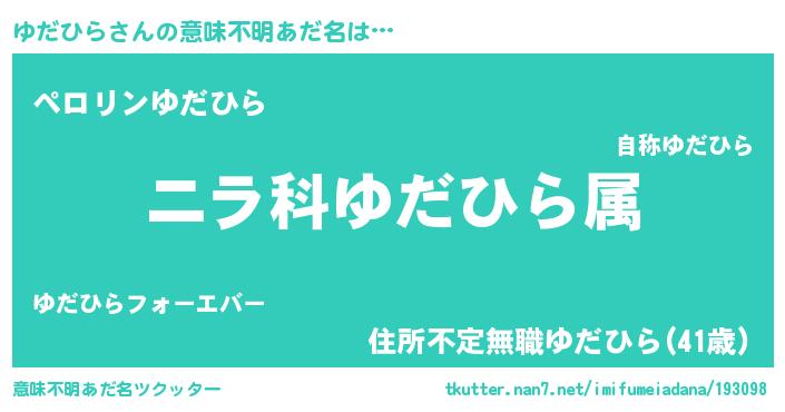 | 男性向けラノベタイトル風あだ名 | 『ゆだひら~年齢イコール彼女いない歴の魔法使い~』 |