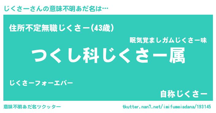 | 男性向けラノベタイトル風あだ名 | 『じくさー~年齢イコール彼女いない歴の魔法使い~』 |