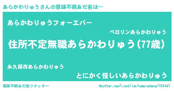 | 男性向けラノベタイトル風あだ名 | 『この素晴らしい世界にあらかわりゅうを!』 |