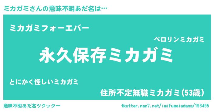 | 男性向けラノベタイトル風あだ名 | 『ミカガミという概念が存在しない退屈な世界 』 |